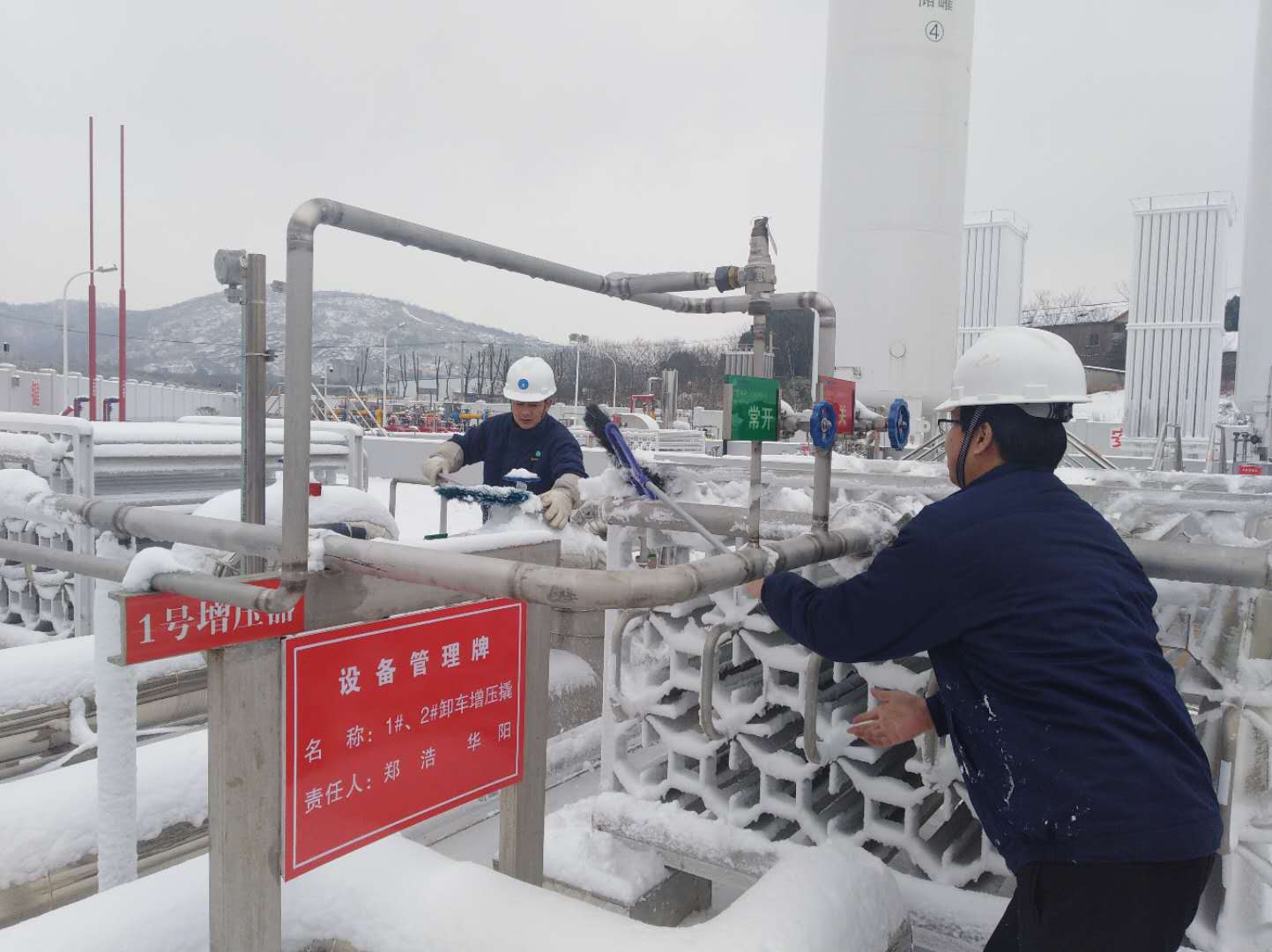隨著低溫天氣持續(xù),我市城區(qū)日用氣量逐日攀升,12月30日已達40萬立方左右。除21萬方管輸氣外,其它氣源均需安慶港華高價購進LNG(液化天然氣)并通過北部新城LNG應急調(diào)峰站不間斷氣化補充。而本次降雪恰逢元旦假期,受高速限行危化品和國道、省道積雪等不利因素影響,有2/3的運送LNG來宜的罐車被迫滯留途中。面對多重挑戰(zhàn),安慶港華沉著應對,一方面多方聯(lián)系附近氣源供應商,不惜成本保供應;另一方面晝夜不間斷清掃站前及站內(nèi)車用通道,確保運氣罐車進出暢通,并及時清除關(guān)鍵設施操作閥門(緊急切斷閥、手動低溫閥)上的積雪,確保高負荷作業(yè)情況下各制氣相關(guān)設施高效運行。