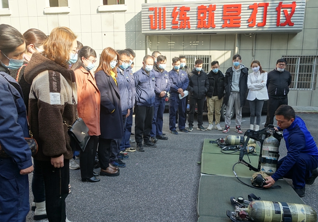 培訓(xùn)中,消防特勤中隊(duì)教官詳細(xì)講解了各消防器材的種類(lèi)、性能、適用火種和操作要領(lǐng),重點(diǎn)演示了干粉滅火器的使用、消防服和空氣呼吸器的穿戴以及消防水帶的使用等,并現(xiàn)場(chǎng)指導(dǎo)港華員工依次進(jìn)行滅火相關(guān)實(shí)操練習(xí)。
