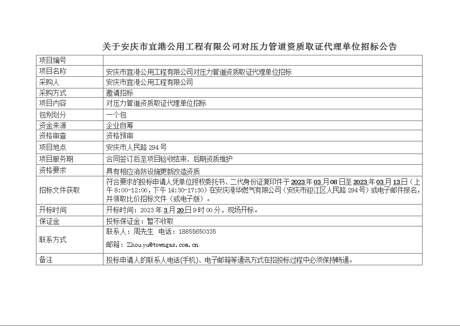 關(guān)于安慶市宜港公用工程有限公司對壓力管道資質(zhì)取證代理單位招標公告