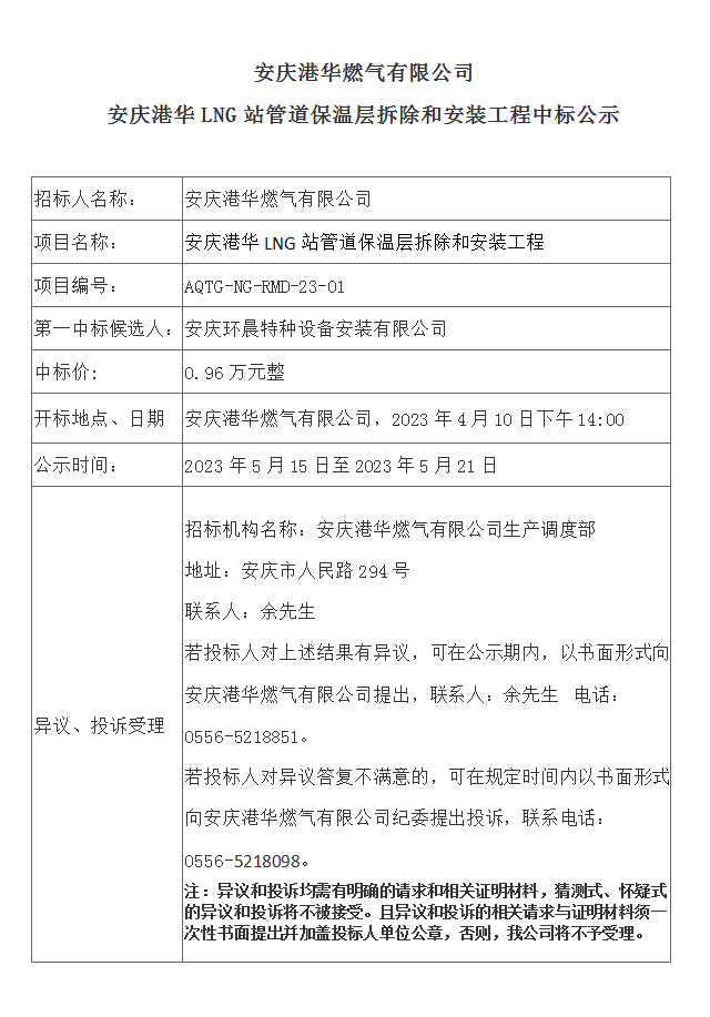 安慶港華燃?xì)庥邢薰景矐c港華LNG站管道保溫層拆除和安裝工程中標(biāo)公示