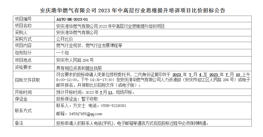 安慶港華燃?xì)庥邢薰?023年中高層行業(yè)思維提升培訓(xùn)項(xiàng)目比價(jià)招標(biāo)公告