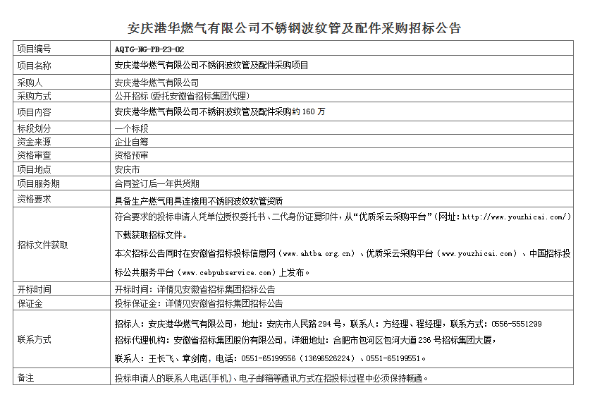 安慶港華燃氣有限公司不銹鋼波紋管及配件采購招標公告