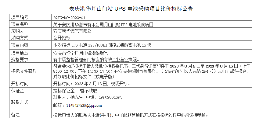 安慶港華月山門(mén)站UPS電池采購(gòu)項(xiàng)目比價(jià)招標(biāo)公告