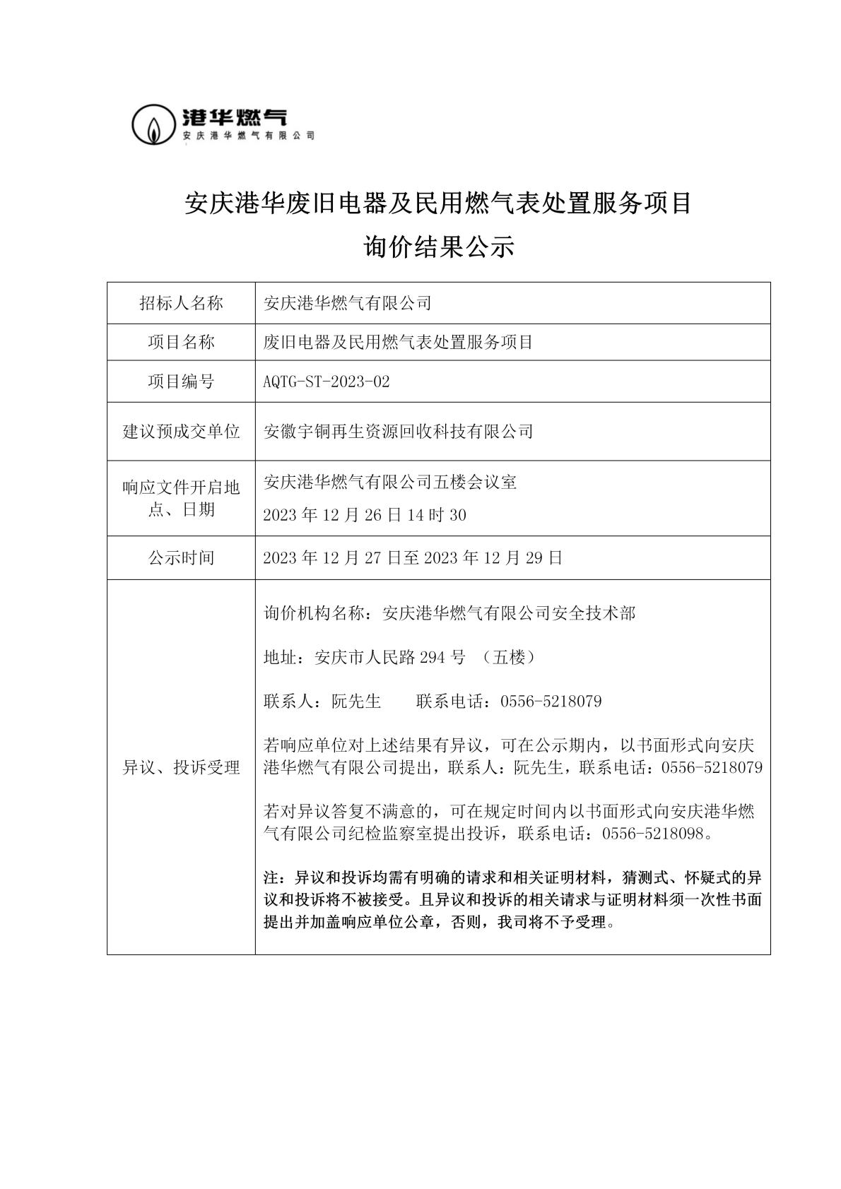 安慶港華廢舊電器及民用燃?xì)獗硖幹梅?wù)項(xiàng)目詢(xún)價(jià)結(jié)果公示