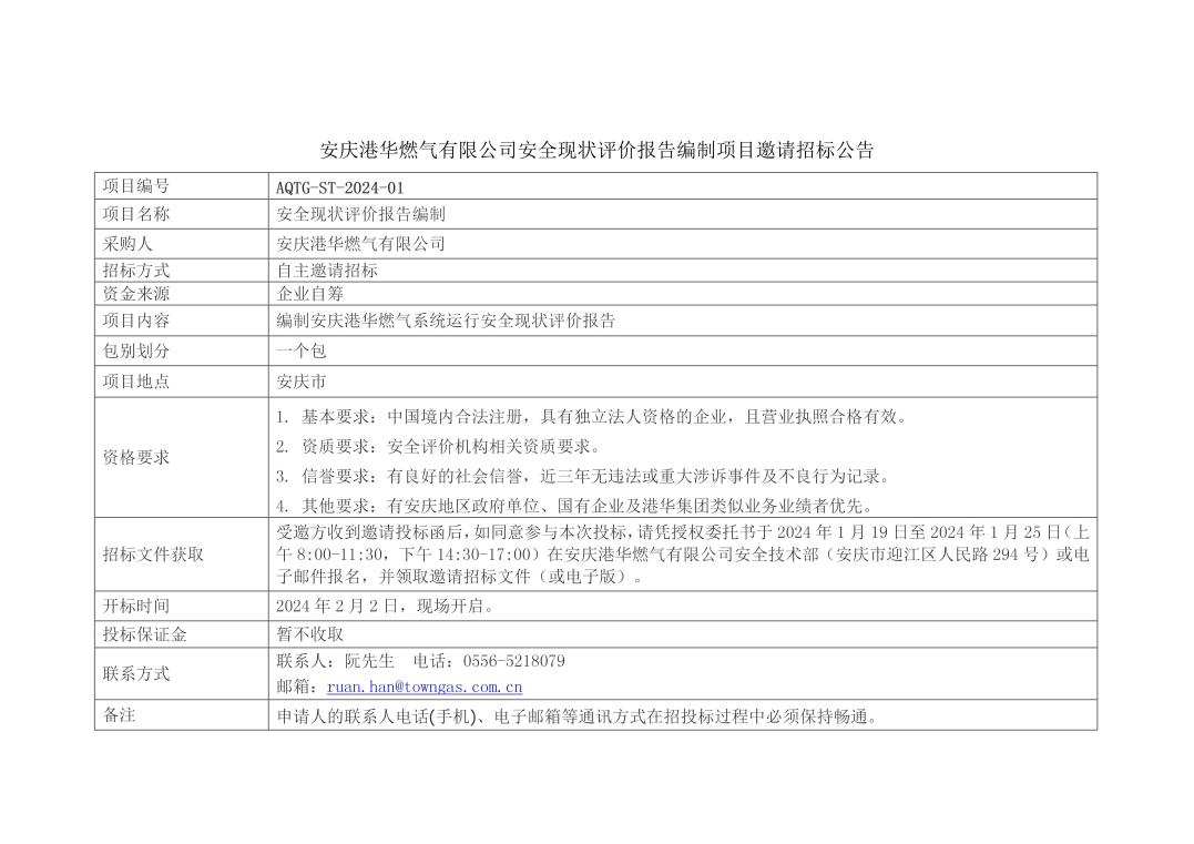 安慶港華安全現(xiàn)狀評價報告編制項目邀請招標公告