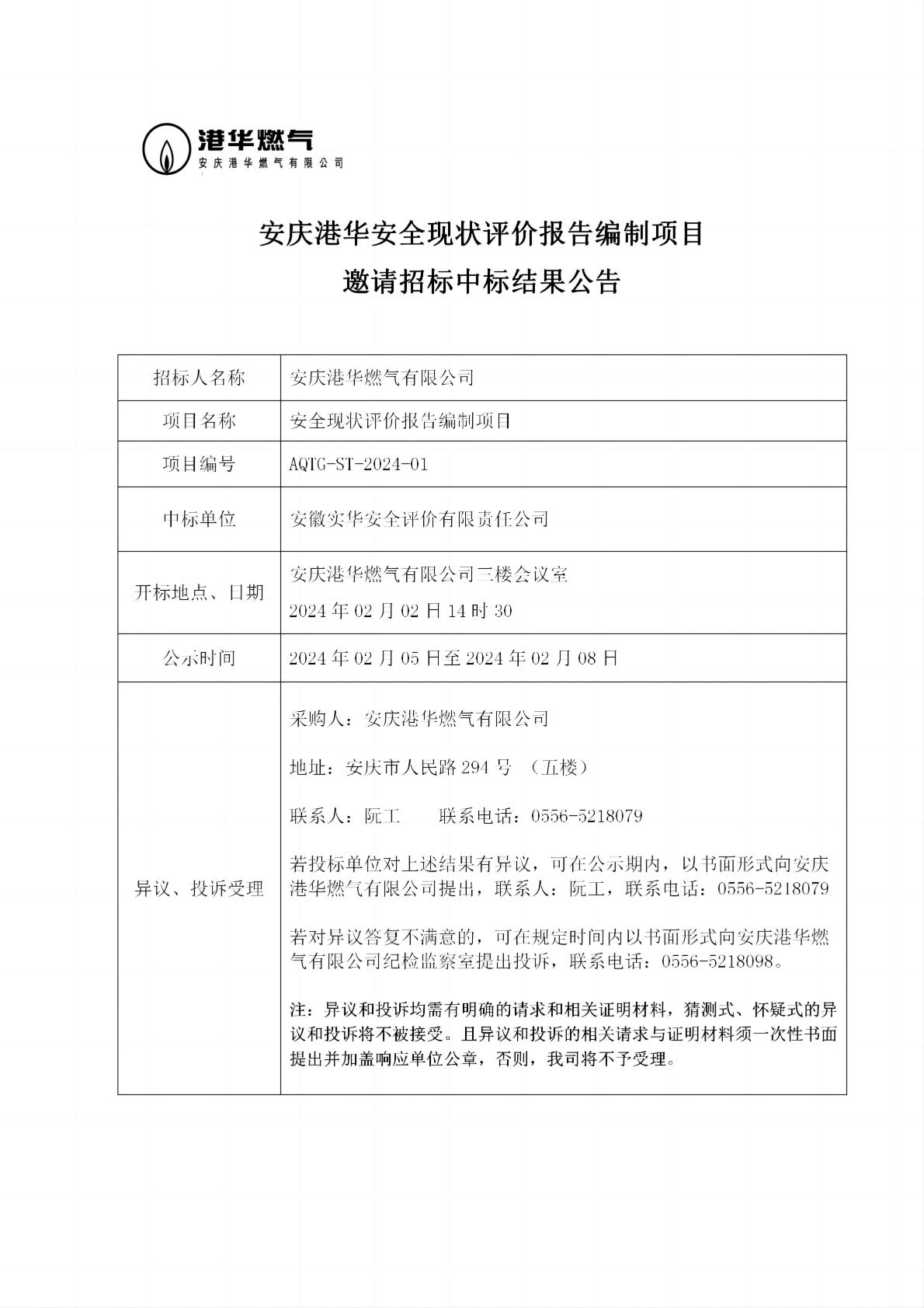 安慶港華安全現(xiàn)狀評價報告編制項目邀請招標(biāo)中標(biāo)結(jié)果公告