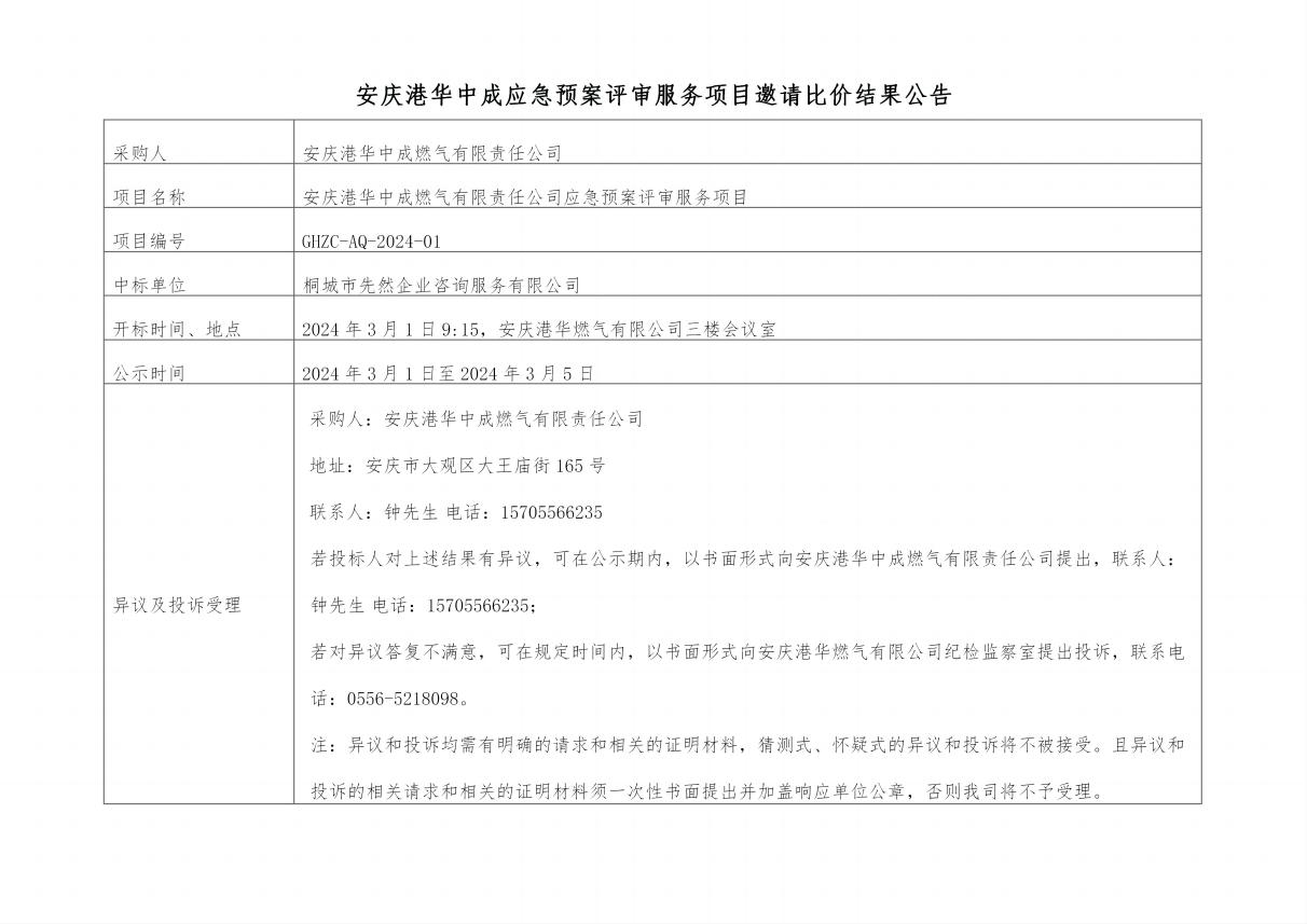 安慶港華中成應(yīng)急預(yù)案評審服務(wù)項目邀請比價結(jié)果公告