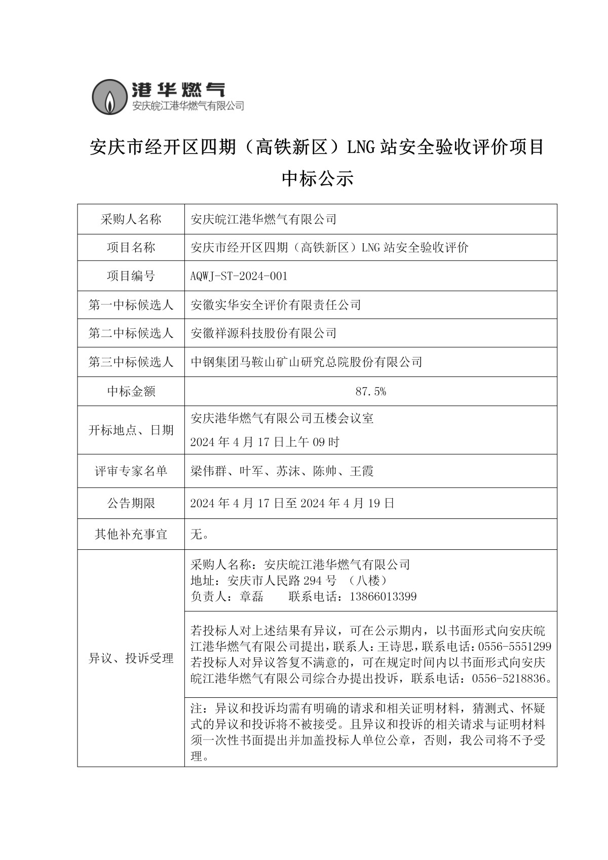 安慶市經(jīng)開區(qū)四期(高鐵新區(qū))LNG站安全驗收評價項目中標公示