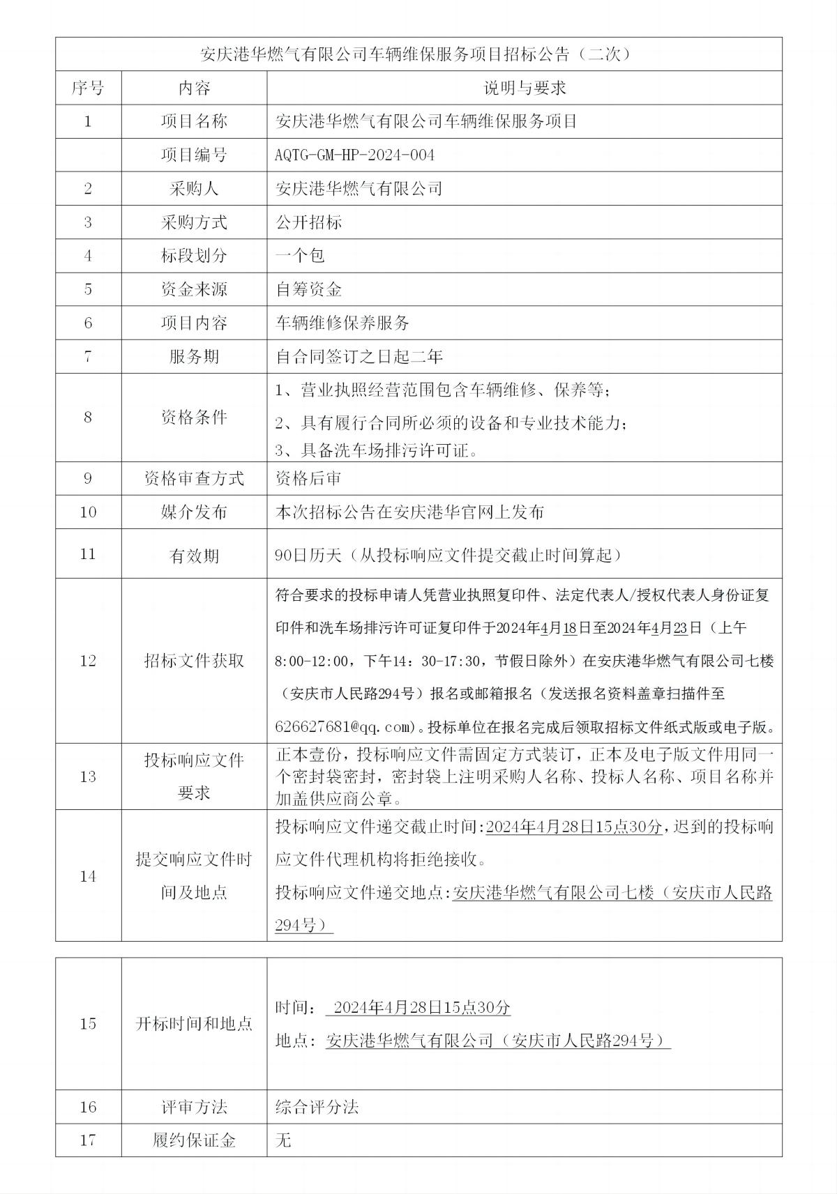 安慶港華燃?xì)庥邢薰拒?chē)輛維保服務(wù)項(xiàng)目招標(biāo)公告(二次)