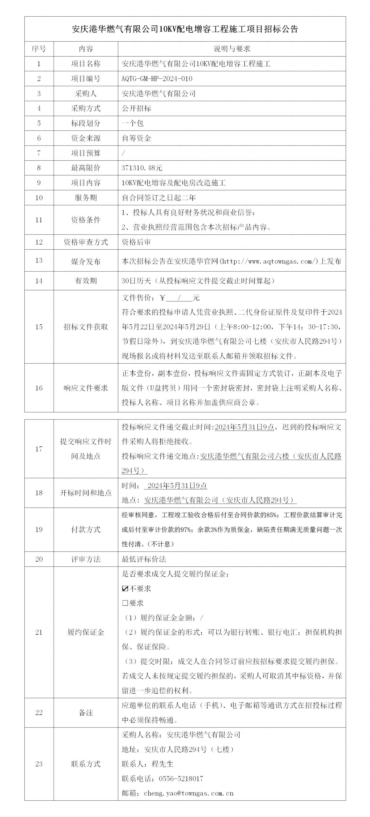 安慶港華燃?xì)庥邢薰?0KV配電增容工程施工項目招標(biāo)公告