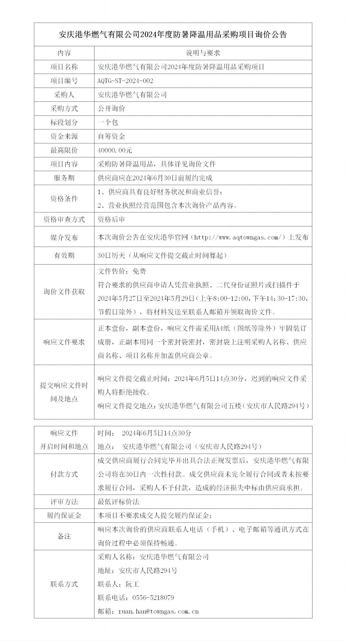 安慶港華燃?xì)庥邢薰?024年度防暑降溫用品采購(gòu)項(xiàng)目詢價(jià)公告