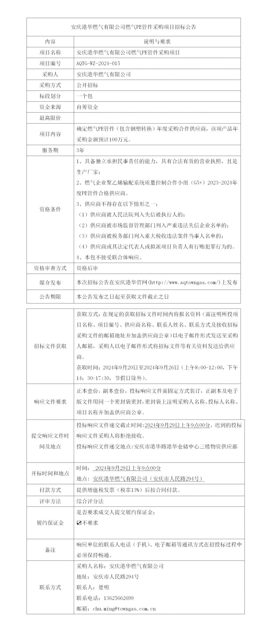 安慶港華燃?xì)庥邢薰救細(xì)釶E管件采購(gòu)項(xiàng)目招標(biāo)公告