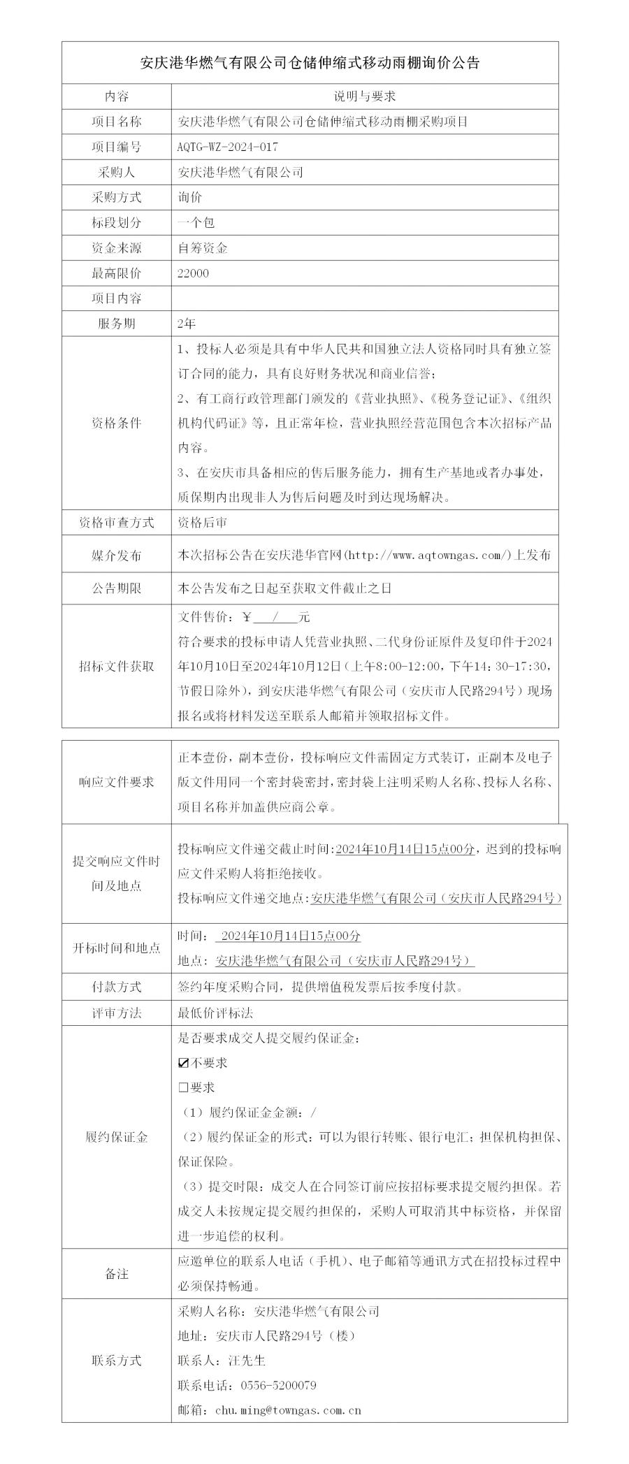 安慶港華燃?xì)庥邢薰緜}儲伸縮式移動雨棚詢價(jià)公告
