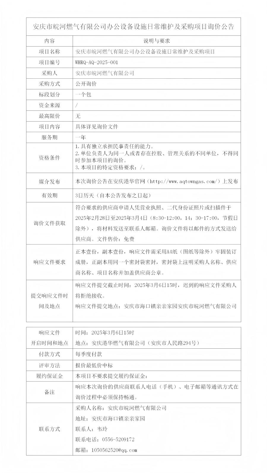 安慶市皖河燃氣有限公司辦公設(shè)備設(shè)施日常維護及采購項目詢價公告