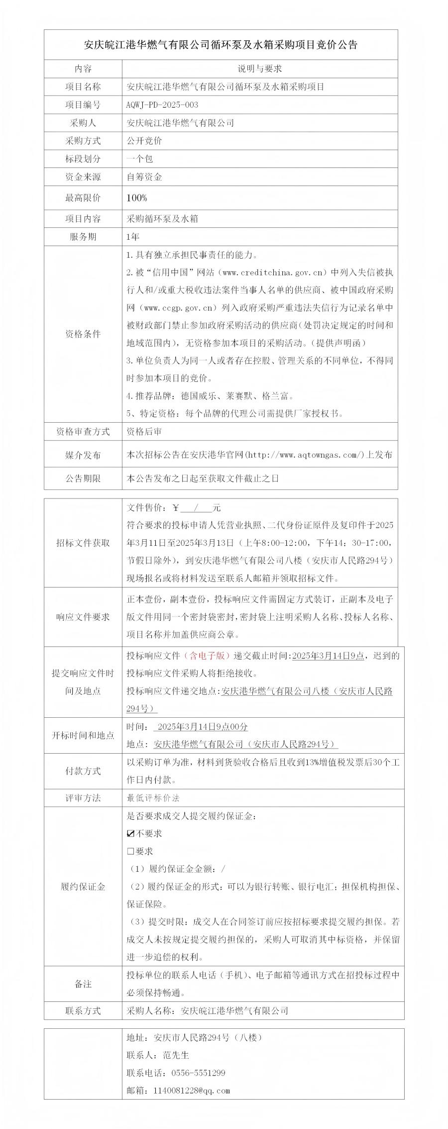 安慶皖江港華燃?xì)庥邢薰狙h(huán)泵及水箱采購項目競價公告