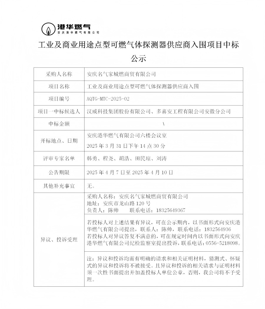 工業(yè)及商業(yè)用途點(diǎn)型可燃?xì)怏w探測器供應(yīng)商入圍項(xiàng)目中標(biāo)公示