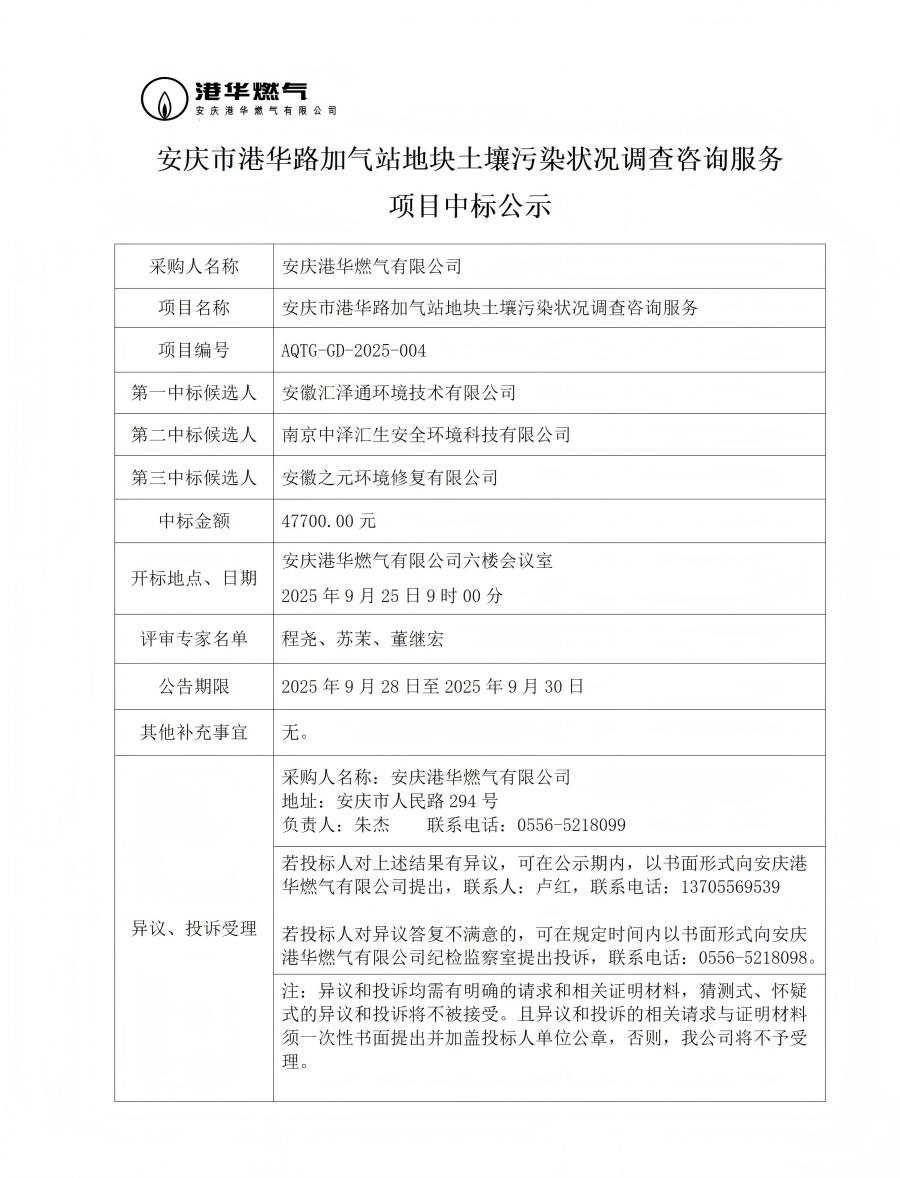 安慶市港華路加氣站地塊土壤污染狀況調(diào)查咨詢服務項目中標公示 發(fā)布時間:2025-09-28    閱讀次數(shù):915次