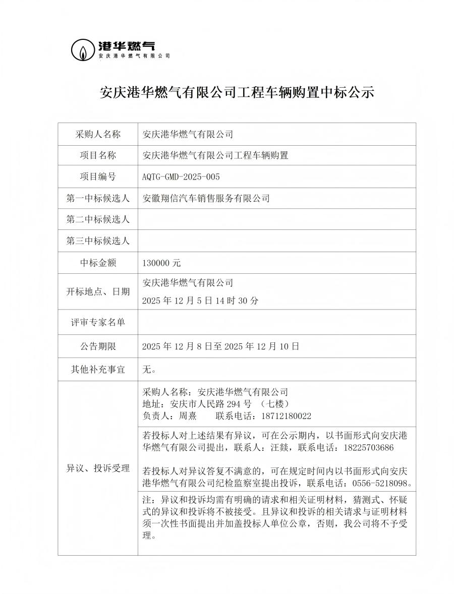 安慶港華燃氣有限公司工程車輛購置中標(biāo)公示